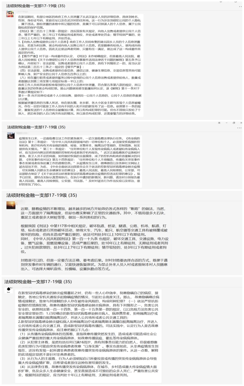 作为法学专业学子,支部成员在疫情发生期间,结合自己所学专业,积极在线上学习、梳理与疫情相关的法律知识,并展开了热烈的讨论,为疫情贡献自己的智慧。讨论涉及了谣言规制、假冒伪劣产品的惩处、疫情防控的方式合法性、企业复工的劳动保障、个人隐私泄露等方面,覆盖面广,内容丰富。