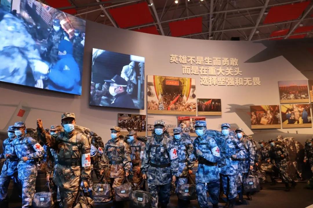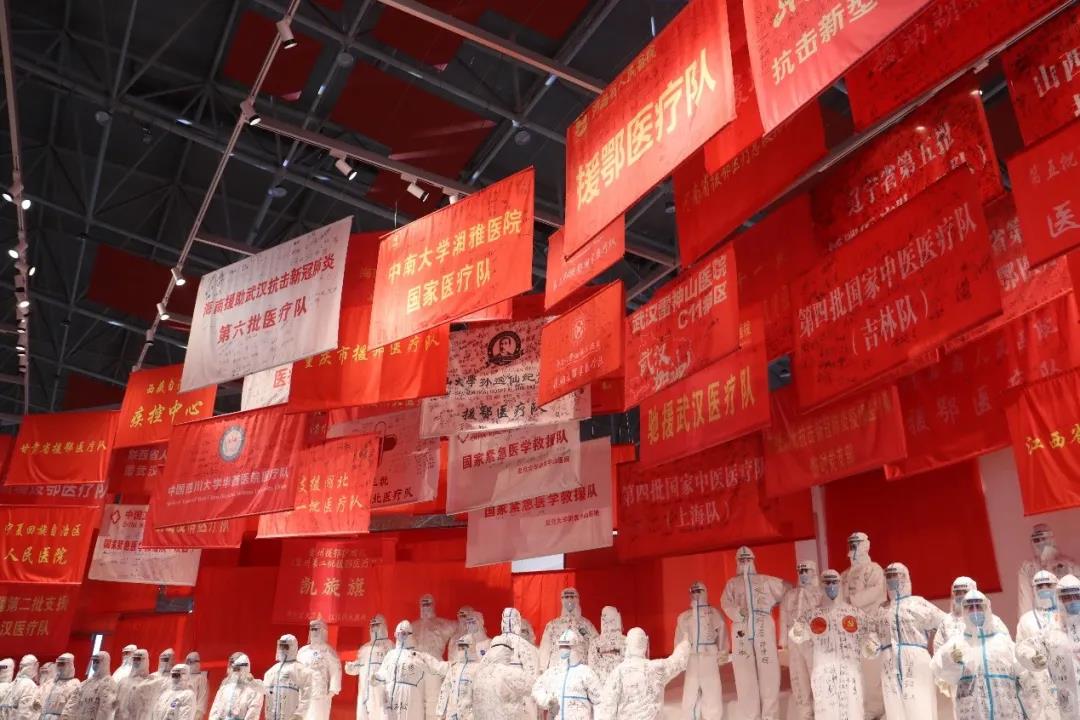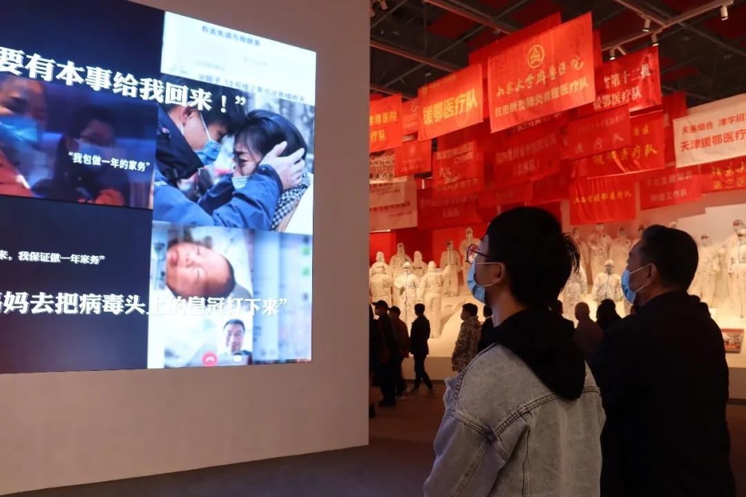 在展览入口,“人民至上,生命至上”的展览标题、各抗疫群体的巨幅艺术画、伟大抗疫精神的标语,为这场惊心动魄的抗疫大战、艰苦卓绝的历史大考奠定了沉重而庄严的基调。