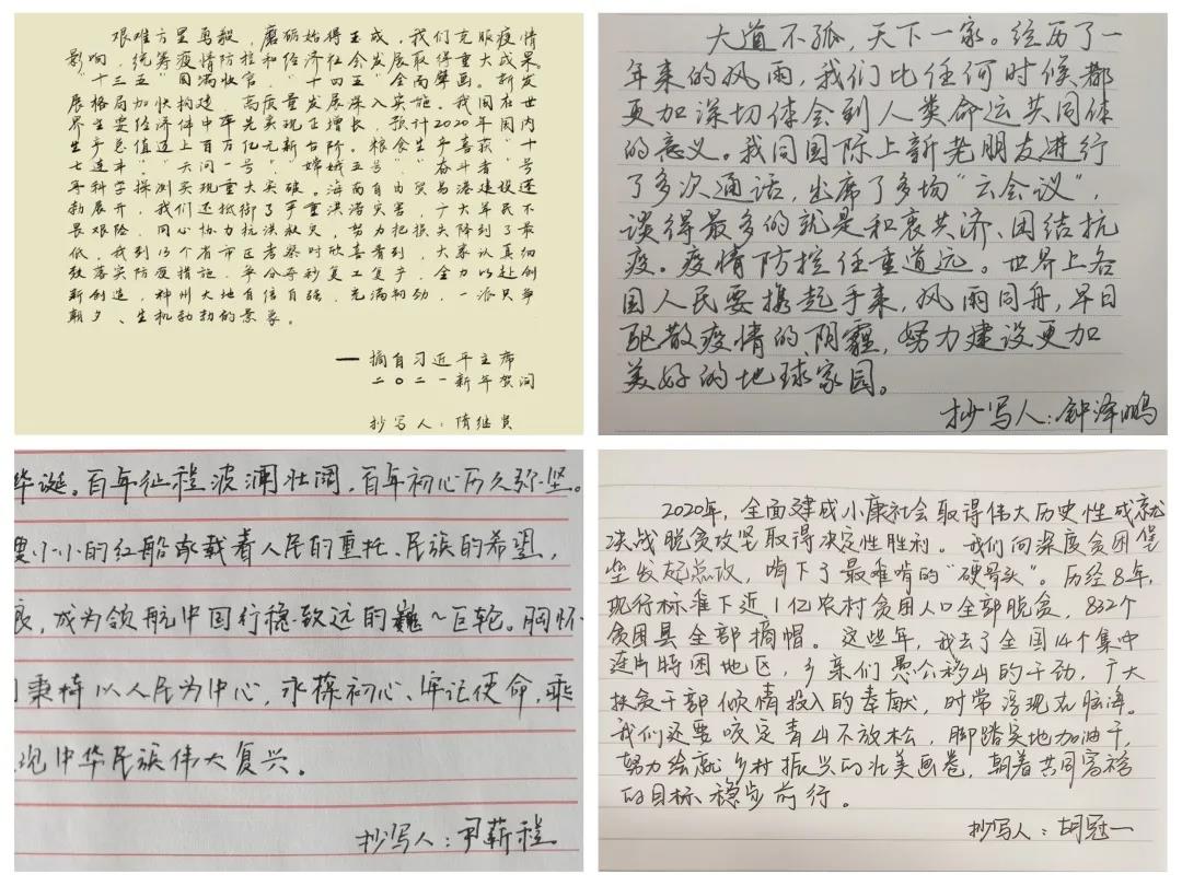 支逸凡同志主持各小组从抗击新冠疫情、统筹疫情防控和经济社会发展、全面建成小康社会故事讲述、改革开放故事讲述、建党一百周年等七个部分对习近平总书记2021年新年贺词进行汇报研讨。在党员代表真挚的朗诵声中,一张张与会党员亲手摘抄的新年贺词“金句”照片依次展示。