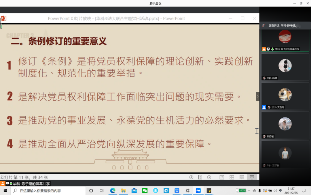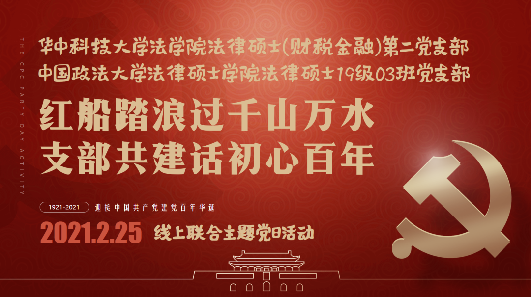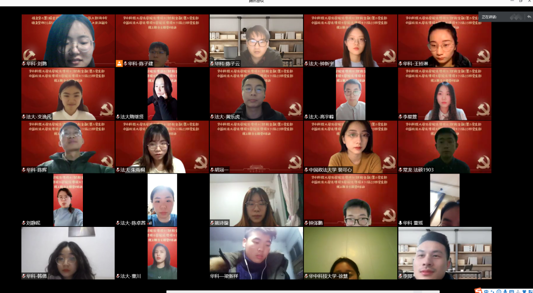 为深化思想理论学习,进一步加强支部间互学互鉴与交流联系, 2月25日晚,华中大伟德国际1946亚洲版法律硕士(财税金融)第二党支部与中国政法大学法硕公司法硕1903班支部相聚云端,共同开展了题为“红船踏浪过千山万水,支部共建话初心百年”的线上联合主题党日活动。会议由公司陈子建同学与中国政法大学支逸凡同学共同主持,两支部的全体党员、预备党员和发展对象参会。