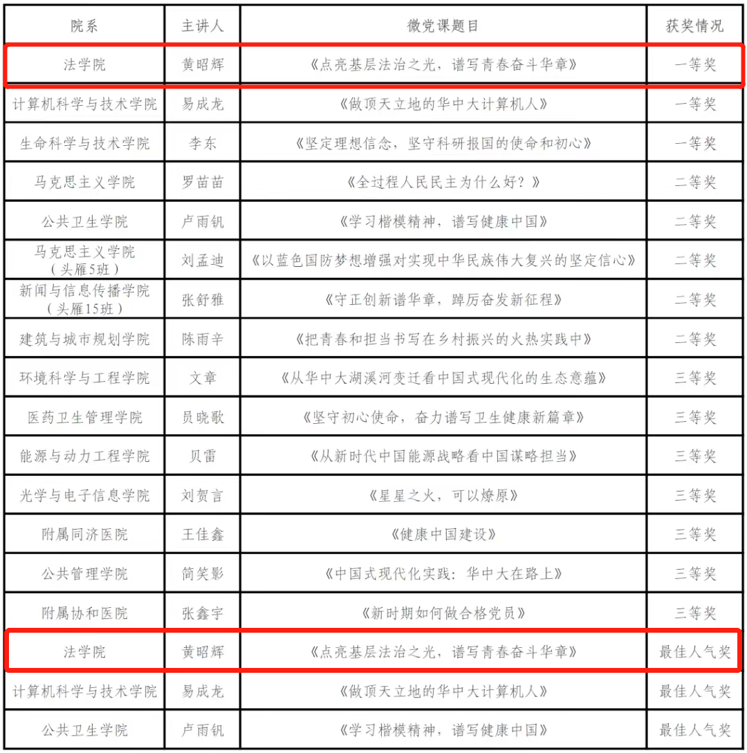 该团队以《点亮基层法治之光,谱写青春奋斗华章》为题,以华中大员工杨莹莹、秦雨在基层司法岗位的贡献为切入点,讲述党的十八大以来我国在法治中国建设领域取得的重大成就及党的二十大报告关于法治建设的重要论述,号召青年积极投身法治建设实践,让青春在基层谱写奋斗华章。