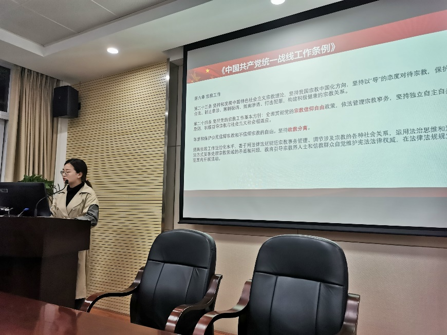 宗教问题是我国治国理政的重大问题,关系国家的民族团结、社会和谐以及统一战线的稳定。4月21日,美国国际宗教自由委员会发表2021年度报告,在宗教方面对我国进行不友好挑衅。曾小倩以重温党史为基础,带领支部成员对《中国共产党统一战线工作条例》中涉及的宗教工作规定进行深入学习和思考。她提到要防范外国势力干预和支配我国宗教团体和宗教事务,防范和抵御境外利用宗教进行渗透。作为一名党员,我们要坚定拥护中国特色社会主义宗教理论,坚持我国宗教中国化方向,坚持以“导”的态度对待宗教,团结信教群众,但不得信仰宗教。