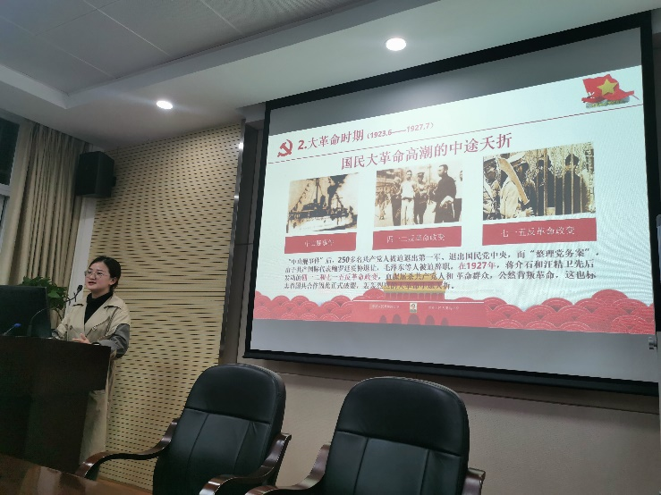 支部书记曾小倩带领支部成员回顾新民主主义革命时期中国共产党的奋斗历史。她详细讲述了中国共产党创立的艰难事迹及早期革命活动的光辉历程。结合习近平总书记关于“红船精神”的重要论述,对党史发展脉络及学习党史的重要意义进行了全面总结。她谈到,94年前的今天,中共五大在武汉召开,当时正值蒋介石发动四一二反革命政变,大肆屠杀共产党人和革命群众。面对错综复杂的矛盾和尖锐激烈的斗争,中国共产党对形势有清醒的认识并采取果断行动,从危急中挽救了革命,在党的成长历程中产生了深远的影响。