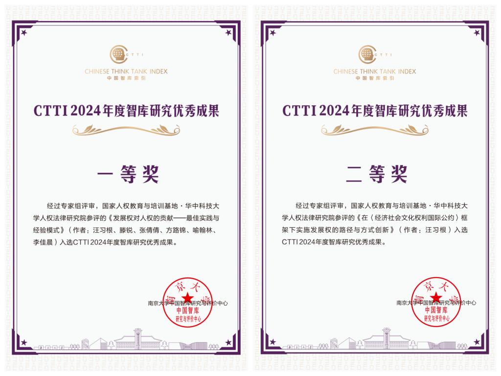 一等奖+二等奖!人权法律研究院研究报告获中国智库索引CTTI优秀成果奖
