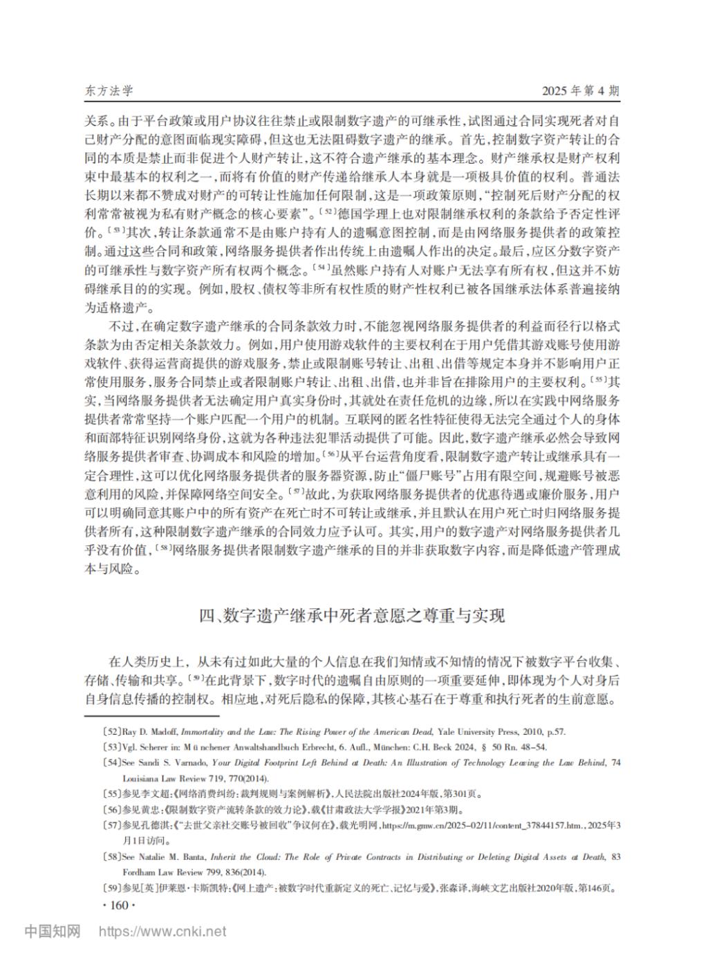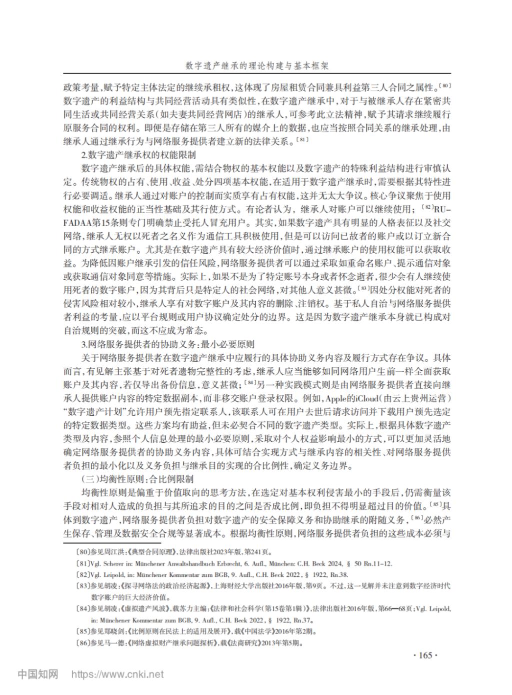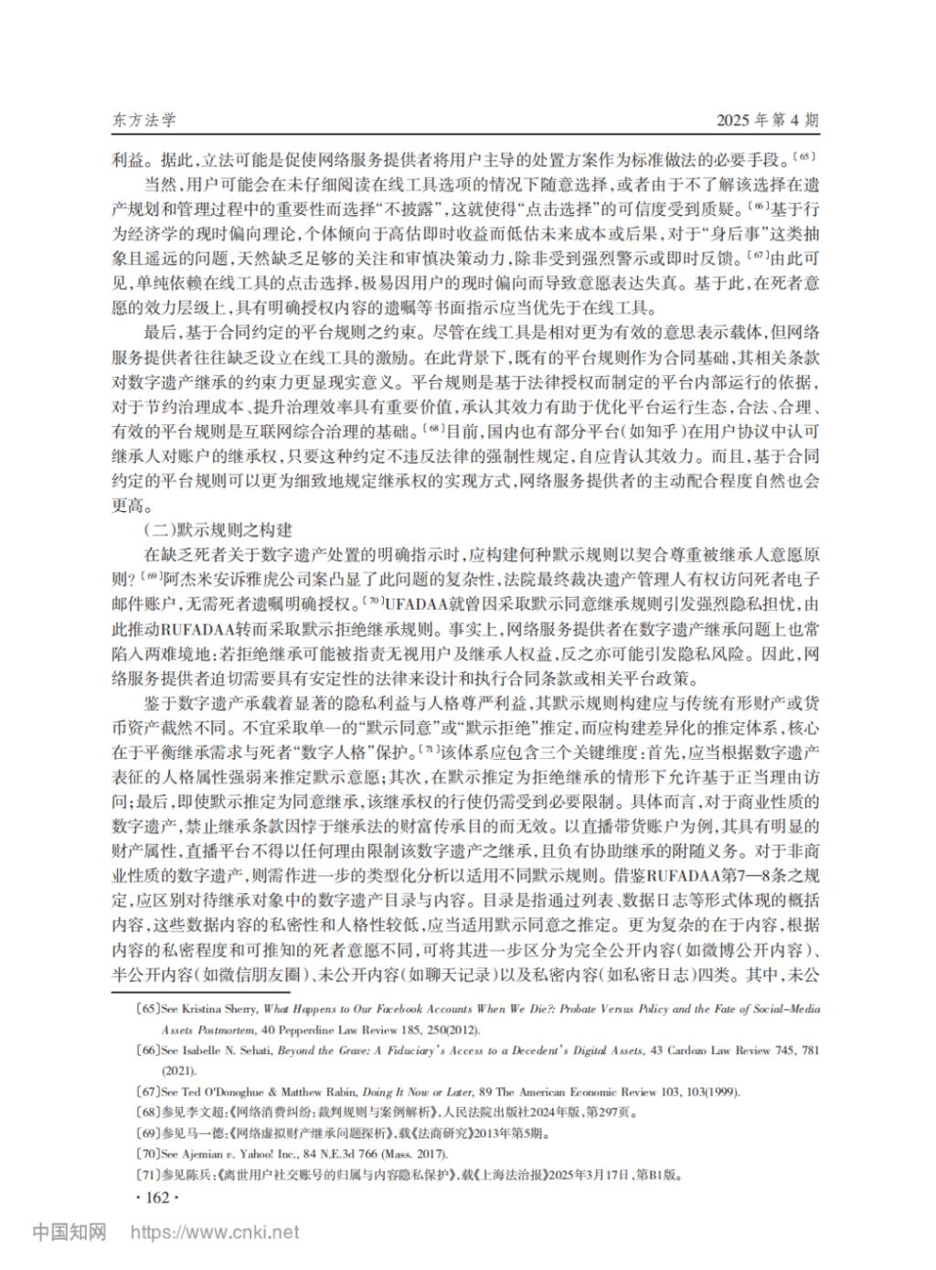 【摘要】将实物遗产继承规则直接适用于数字遗产面临理论障碍,有必要系统反思并构建相应的继承规则。数字遗产的可继承性是首要问题,关于侵犯死者或通信对象的隐私、破坏社会信任基础等担忧均可通过学理阐释或技术方式予以化解。若将继承法上的遗产性质界定为一项法律地位,即可将数字遗产纳入实证法调整范围。简单地以用户协议中的数字遗产条款来安排权利结构可能有悖于继承法原则,具体规则构建应当以尊重死者意愿为核心原则,依序通过遗嘱等书面指示、平台在线工具、平台规则等方式认定死者意愿。若前述方式缺位,则根据数字遗产的商业性程度和人格属性嵌入程度,设计类型化的死者意愿默示规则。为平衡网络服务提供者、死者、近亲属、通信对象及公共利益,应当以比例原则为分析框架合理限制数字遗产继承,包括以正当理由为继承条件,排除其他用户的数字资产,遵循最小必要原则确定继承方式等。