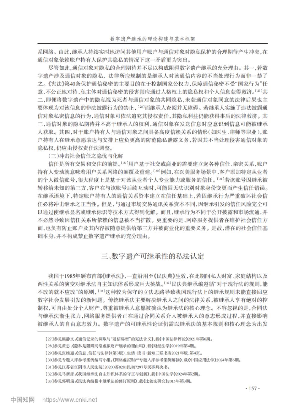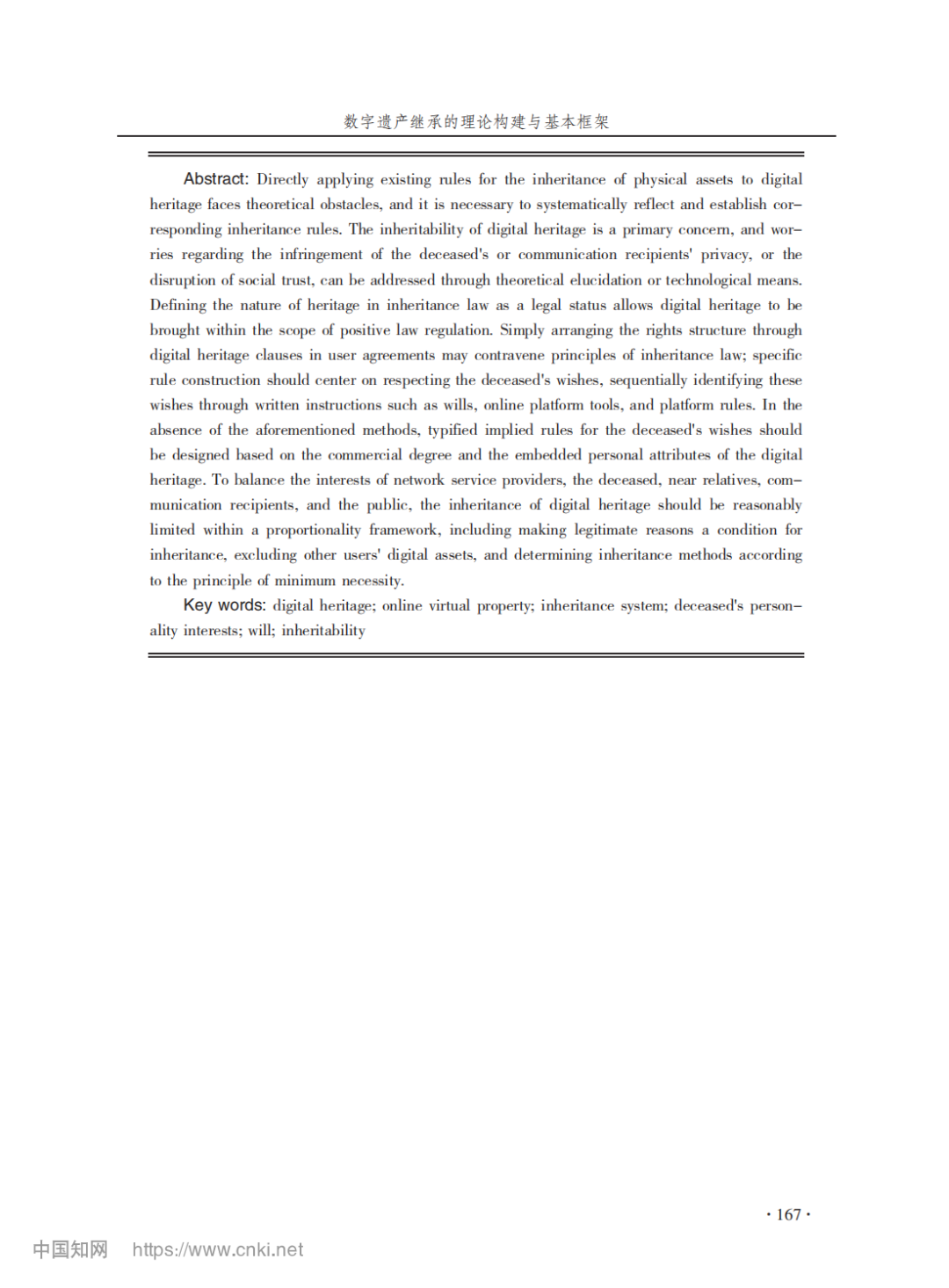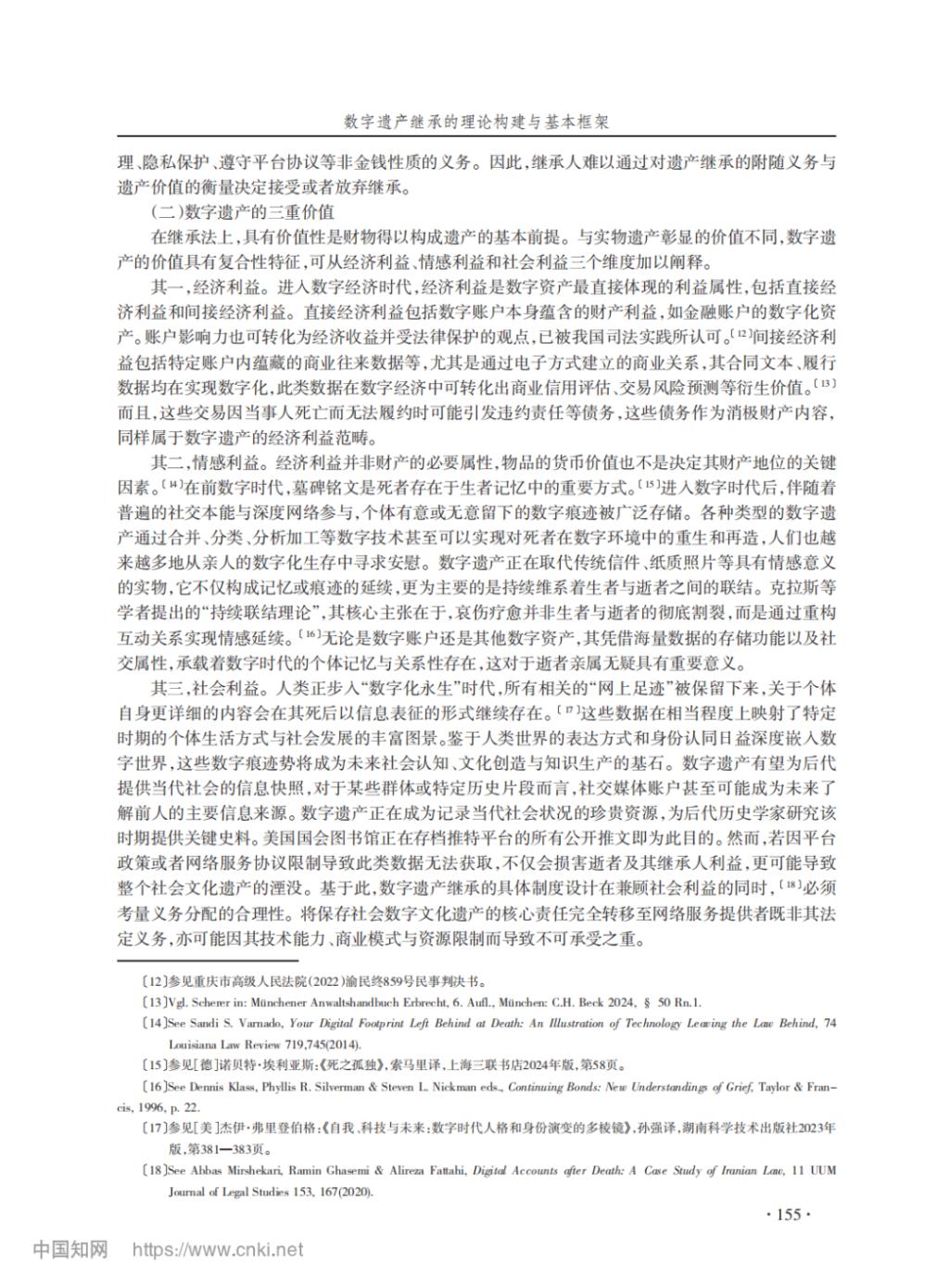 【摘要】将实物遗产继承规则直接适用于数字遗产面临理论障碍,有必要系统反思并构建相应的继承规则。数字遗产的可继承性是首要问题,关于侵犯死者或通信对象的隐私、破坏社会信任基础等担忧均可通过学理阐释或技术方式予以化解。若将继承法上的遗产性质界定为一项法律地位,即可将数字遗产纳入实证法调整范围。简单地以用户协议中的数字遗产条款来安排权利结构可能有悖于继承法原则,具体规则构建应当以尊重死者意愿为核心原则,依序通过遗嘱等书面指示、平台在线工具、平台规则等方式认定死者意愿。若前述方式缺位,则根据数字遗产的商业性程度和人格属性嵌入程度,设计类型化的死者意愿默示规则。为平衡网络服务提供者、死者、近亲属、通信对象及公共利益,应当以比例原则为分析框架合理限制数字遗产继承,包括以正当理由为继承条件,排除其他用户的数字资产,遵循最小必要原则确定继承方式等。