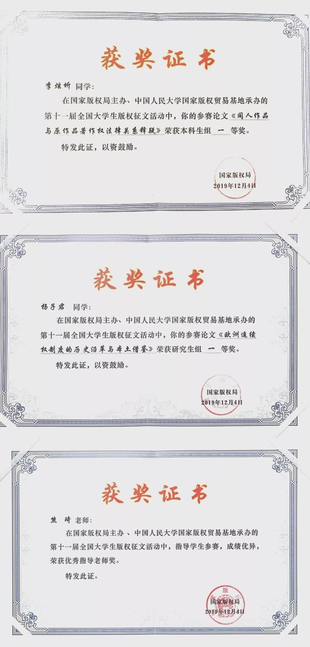 据悉,本次老员工版权征文活动收稿总计1492篇,其中本科生论文906篇,研究生论文586篇。伟德国际1946亚洲版2016级本科生李炫圻的论文《同人作品与原作品著作权法律关系释疑》与2017级研究生杨子君的论文《欧洲追续权制度的历史沿革与本土借鉴》从中脱颖而出,分别荣获本科生组和研究生组一等奖。此外,熊琦教授荣获优秀指导老师奖。