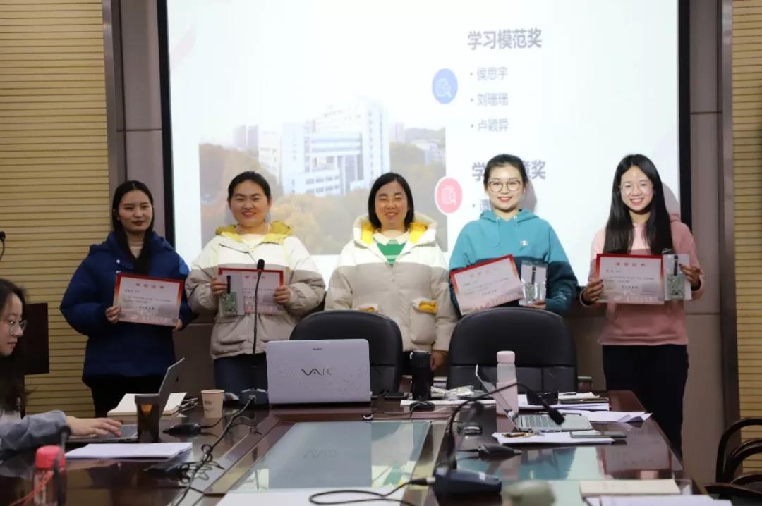 会上,辅导员甘圆圆老师为“学习打卡”活动中获得学习模范奖侯思宇、刘珊珊、卢颖异同学和获得学习创意奖的谭喻同学颁发奖品与证书,并鼓励大家多学习理论知识,只争朝夕,不负韶华。