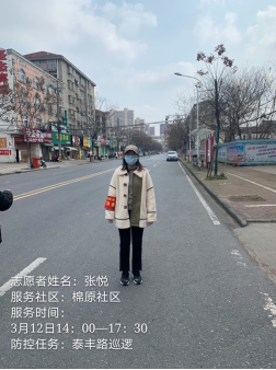 张悦,1806班法学硕士,经济法专业,来自湖北潜江。志愿服务社区为湖北省潜江市泰丰办事处棉原社区。