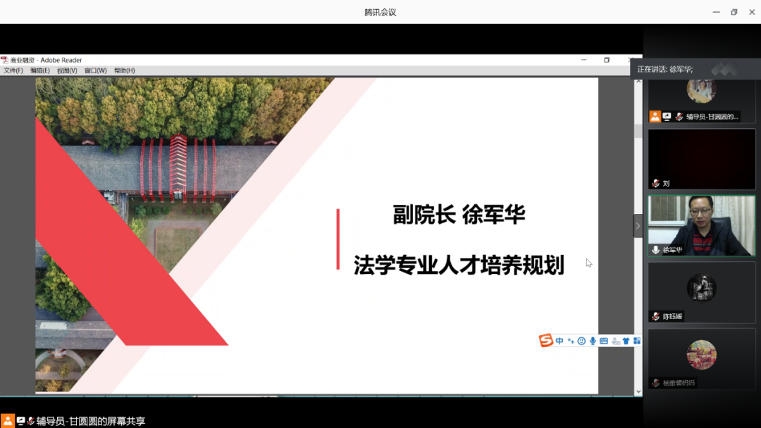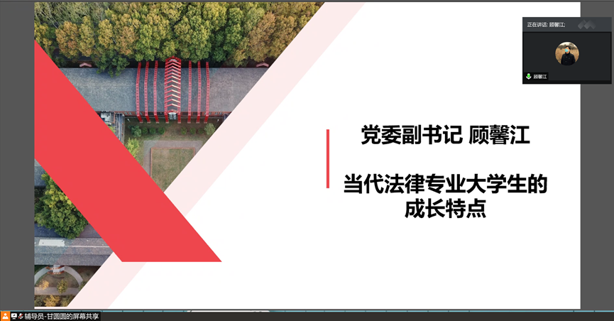 徐军华简要介绍了公司和公司的基本办学情况以及公司人才培养规划作。他介绍了公司的优势学科、新兴学科、德语班,由学业导师加职业导师构成的双导师制,以及公司为打造应用型人才而要求同学们应该做到的“七个一”,即观摩一次庭审、参加一次模拟法庭、参与一项科研项目、每月至少听一场讲座、进行一次社会实践、进行一次国际交流、参加一项法律专业比赛。