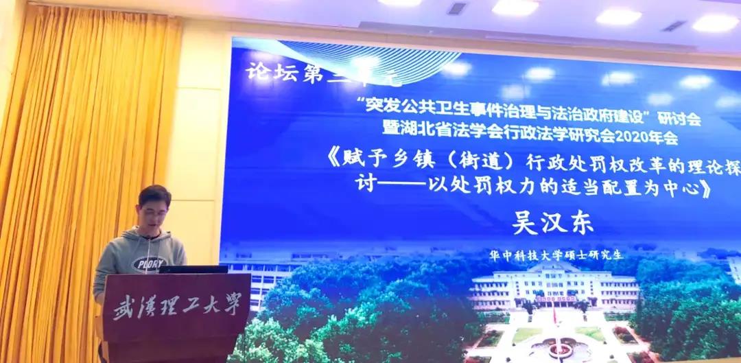 湖北省法学会行政法学研究会顾问、公司曹海晶教授主持本次会议的主题发言环节。在第三研讨单元,公司2018级硕士研究生吴汉东针对“法治政府建设的理论与实践”议题,以《赋予乡镇(街道)行政处罚权改革的理论探讨——以处罚权力的适当配置为中心》为题作大会报告。报告主要围绕赋予乡镇(街道)行政处罚权的实践探索与立法回应、行政处罚权力适当配置的原则、赋予乡镇(街道)行政处罚权的内在逻辑和要求三个方面展开。通过对民主集中制原则内涵的功能主义阐释和运用,他认为赋予乡镇(街道)行政处罚权应遵循授权决定的民主性、授权范围的适当性、受权主体的最适性和受权主体的调整性等要求,最终实现行政处罚权力适当配置的目的。