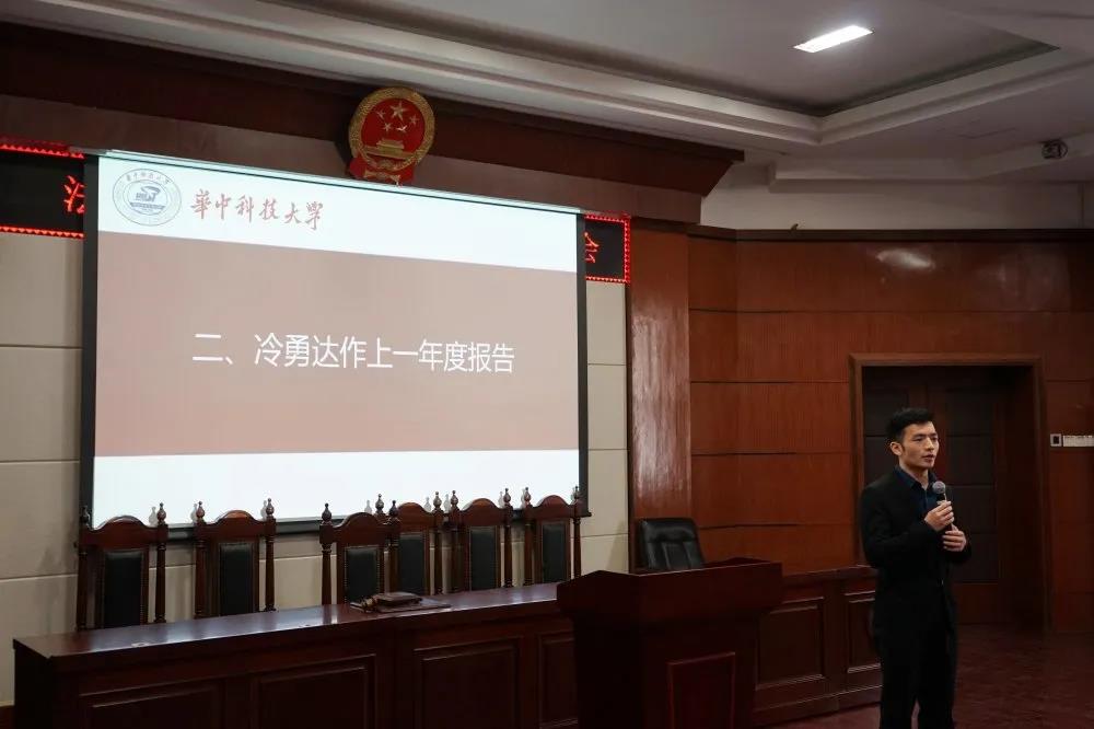 议程第二项,法竞中心上任主任冷勇达同学对上一年度竞赛中心工作做简单汇报。冷勇达通过讲述竞赛中心成立背后的小故事来激励竞赛中心成员们不惧艰辛,追求卓越。