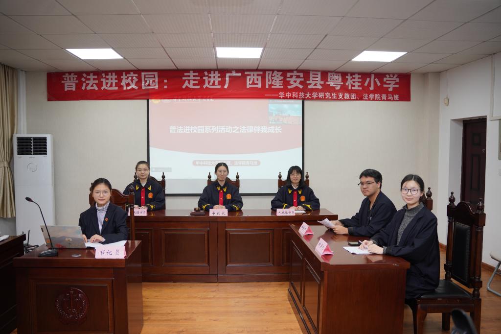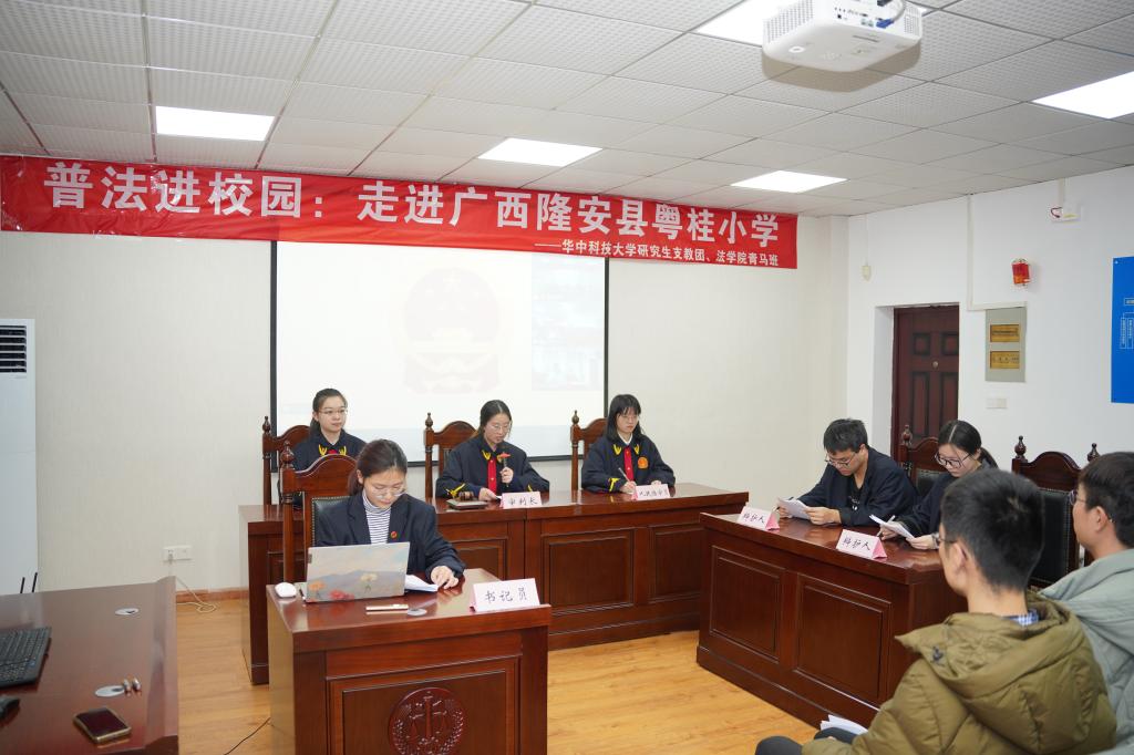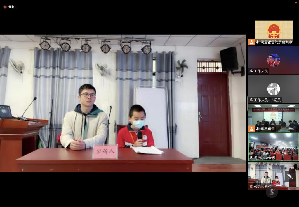 12月2日,在第九个国家宪法日即将到来之际。伟德国际victor1946研究生支教团广西隆安分队携手伟德国际1946亚洲版2023届研支团成员、青马学员,通过线上模拟法庭的方式为广西隆安县粤桂小学的200余名师生带来一场生动的普法课。