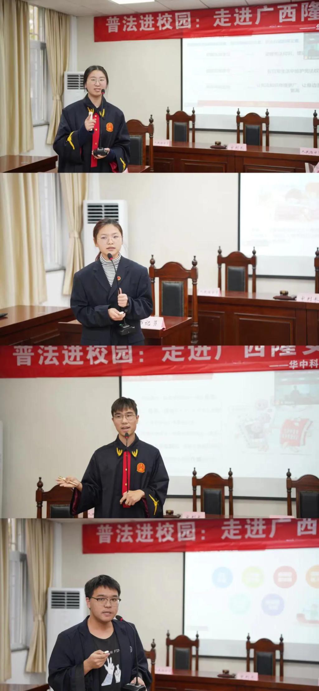 本次活动包含普法宣讲与模拟法庭两个部分。宣讲部分,志愿者们精心设计、积极准备,从贴近同学们日常生活的话题出发,围绕“宪法是我国的根本大法”“拒绝校园欺凌从我做起”“网络不是法外之地”“警惕电信诈骗”几个方面进行了宣讲,用“小故事”诠释法治“大道理”,助力青少年系好第一颗“法治扣子”。
