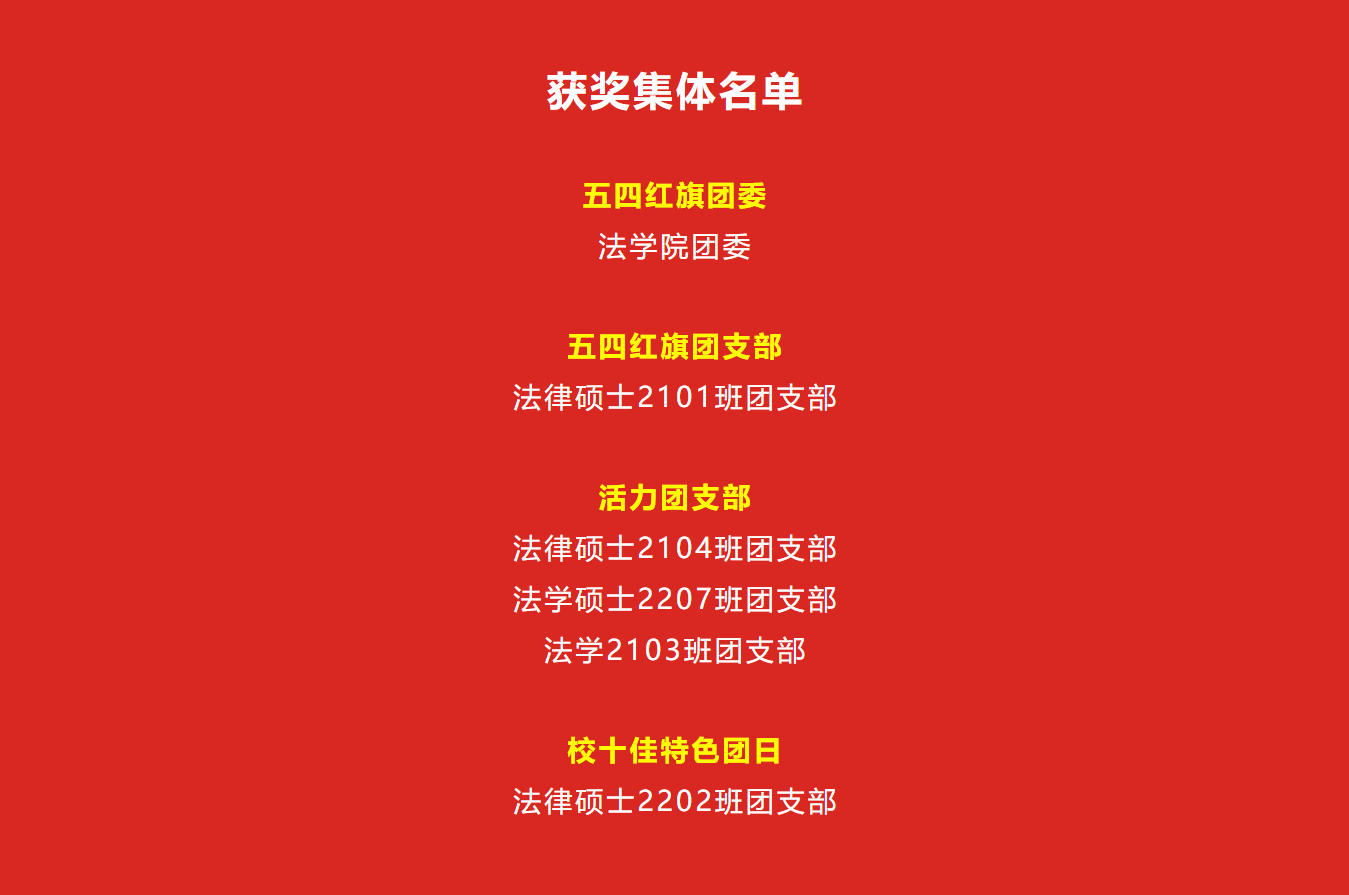 伟德国际1946亚洲版在全体师生的共同努力下荣获多项荣誉。伟德国际1946亚洲版团委获评“五四红旗团委”,法律硕士2101班团支部获评“五四红旗团支部”,法学专业2103班等3个团支部获评“活力团支部”,法律硕士2202班获评校十佳特色团日。