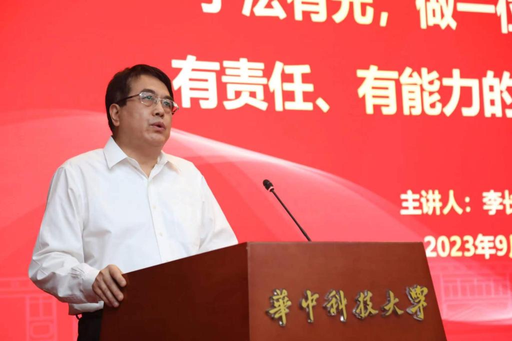 李长健为新生作入学教育。他首先祝贺同学们能够走进精彩纷呈的法学世界,顺利开启法律人的进阶发展之路。明德笃行,立己达人,他激励同学们能够在法学道路上于法有光,做一位有理想、有责任、有能力的卓越法律人。最后,他希望同学们积极发扬“德法兼修、追求卓越”的伟德国际1946亚洲版优良传统,为依法治国与中国式现代化法治建设贡献华中大法律人的青春与力量。