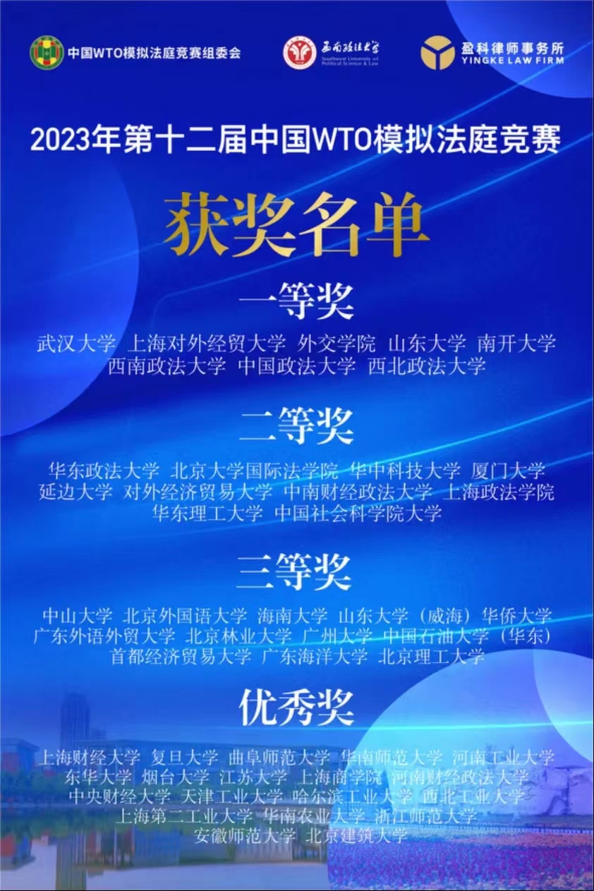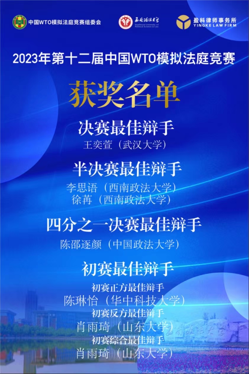 近日,2023年第十二届中国WTO模拟法庭竞赛落下帷幕。经过激烈角逐,公司代表队在全国49个赛队中脱颖而出,荣获全国二等奖、被诉方书状二等奖。陈琳怡同学在庭辩中收获了全国唯一满分并荣膺初赛最佳辩手称号。