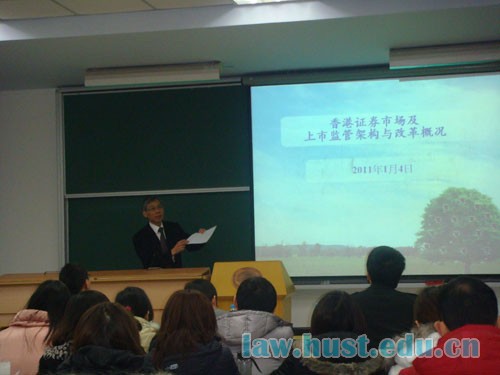 1月4日上午,香港交易及结算所有限公司上市科副总监连达鹏教授在西十二楼S308教室为公司法律硕士财税金融法班的同学进行了题为“香港证券市场发展与上市监管”的讲座。公司09级、10级法律硕士财税金融法班同学以及部分经济法专业法学硕士参加了此次讲座,公司彭礼堂教授和管斌副教授一同出席了该讲座。