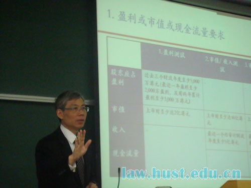 连达鹏教授的讲座包括两大部分:一是香港证券市场与上市监管架构及改革概况;二是IPO——在香港主板上市的程序与审批。在第一部分,连达鹏教授结合市值、首次公开招股额、总融资额、投资者分布、上市企业规模结构、香港与内地证券市场对比、上市证券的类型等方面的讲述,并应用大量数据对香港证券市场发展的基本情况进行了总体的概述。在此基础上,连教授对香港上市监管的“香港政府——香港证监会——香港交易所”三层架构进行了细致的分析,并对三者间的权责分工和内部组织结构加以介绍,指出香港采用的是一种分权制衡的监管模式。同时,连教授还对香港联交所推出的上市监管改革措施进行了介绍和分析。 第二部分中,连达鹏教授对上市公司在香港主板上市的基本程序、审核过程、审核标准进行了系统的介绍,并从盈利/市值/现金流要求、管理层及控股权的连续性、最低市值及公众持股比例、财务资料、一般披露要求等方面介绍了香港对上市公司审核的一些具体的规定。在此基础上,连教授也对香港证券市场公司上市过程中常见的IPO前投资、上市申请人与控股股东关系、合约安排等问题及应对方法等进行了阐述,并对有关上市公司要求的一些豁免性规定加以了介绍。 1月5日下午,连达鹏教授在伟德国际1946亚洲版204会议室与财税金融法和国际经济法专业硕士研究生进行了交流。在交流中,连教授与公司同学进行了热烈的互动和讨论,连教授对同学们提出的关于内地公司境外上市的原因和存在的法律风险、香港对不同类型投资者赔偿标准的区分、香港各监管机构间的监管重叠和监管空白、QFII和QDII、香港证券市场退市机制等问题一一做了回应。公司彭礼堂教授、管斌副教授和王天习副教授出席了本次交流会,并就相关问题同连达鹏教授进行了深入的交流。