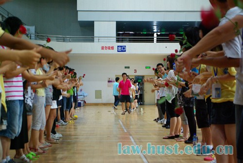 湖北省博物馆 学术盛宴之思 下午进行的是俞江教授的法学专题讲座。讲座题为“双层所有权的历史与批判”。俞江教授以小故事“拥有自己的树”为切入点,将中国民法的发展史中所有制的发展作了一个简要的回顾。并深刻剖析了民国时期的宪法、土地所有权制度以及当今中国大陆的所有权体系中的双层结构,与当今的房屋拆迁等热点问题进行了比较。讲座结束,俞江教授与在座营员展开讨论,并耐心听取解答了同学们的疑问。 深情厚谊之乐 讲座结束后,在光谷体育馆举行了法雨缤纷夏令营素质拓展活动。活动中,每一个团队都展示了自己的风采。在“能量传输”小游戏中,每一个小组都能紧密合作,展示了良好的团队合作能力。在“共同进退”游戏中,每一个队员都展示了良好的心理与身体素质,在游戏中收获了友谊收获了快乐。素质拓展结束后,法雨缤纷营员为来自台湾东吴大学的刘思妤庆祝生日,并送上事先准备好的玫瑰花和生日蛋糕,带给她了一个惊喜,并送上美好的祝愿。在吹灭蜡烛许愿的时候,刘思妤说:“希望在这里的所有的法科学子都能找到理想的职业,通过律师职业考试,当上检查官法官等。”