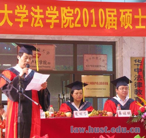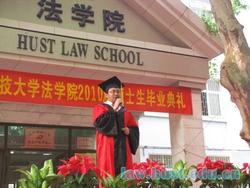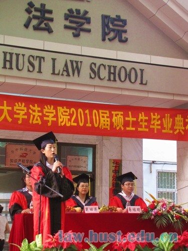 2010届法律硕士毕业生刘同同学作为毕业生代表上台发表了毕业感言,他首先祝贺了所有毕业生取得学位,代表大家向老师、家人表达了最衷心的感谢。深情回顾了三年相知、相扶、相助的难忘生活,他表示,“毕业不是梦想的终点,我们才刚迈向卓越人生的起跑线;暂时的分别不是永世的隔离,不久的将来再聚首定然是前途焕然。”最后,千言万语化作对母校的深深祝福,祝愿母校捷报频传,硕果累累;祝福恩师身体健康,桃李满疆;祝愿亲爱的同学们幸福安康,事业辉煌。