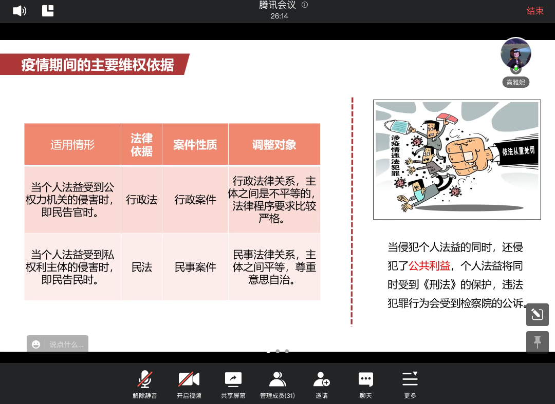 本次疫情防控普法宣讲,具有及时性,从当前防疫形势出发,深刻分析了防疫成果的来之不易;宣讲突出专业性,以法律思维详析防疫案例,以案明理,以理服人;宣讲充满鼓舞性,通过防疫与法律的结合,我们更加深刻地领悟到法治何以增强社会“免疫力”、提高民族“战斗力”,而更加自觉地遵守防疫法规政策、做好个人防护、团结战胜疫情!