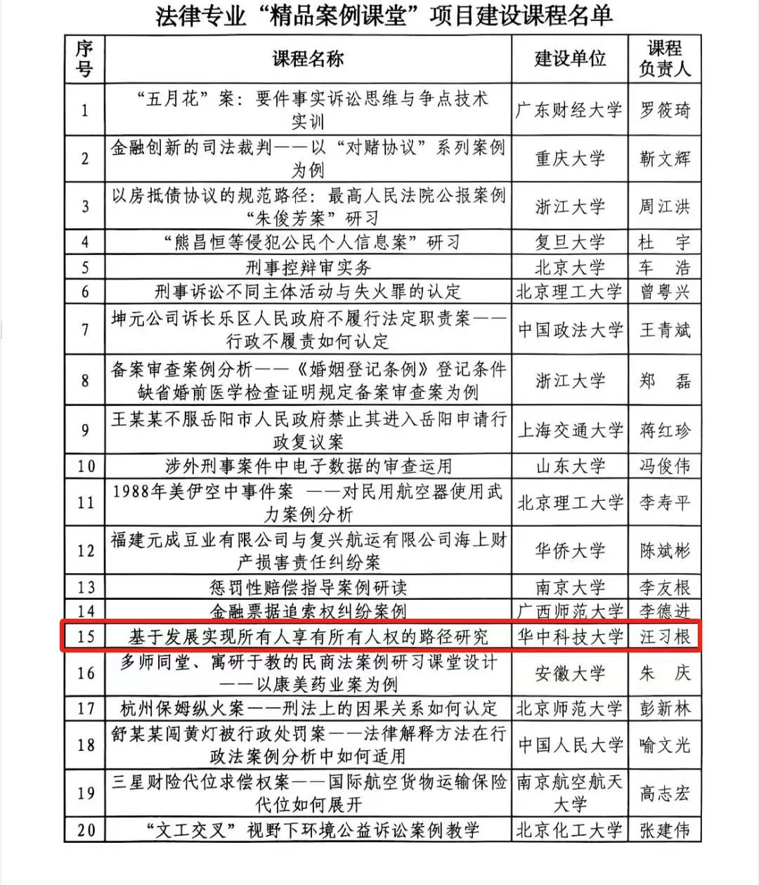 近日,全国法律专业学位研究生教育指导委员会公布了第二批法律专业“精品案例课堂”项目建设课堂名单的通知。经过院校申报、专家评选,全国法律专业学位研究生教育指导委员会确定立项建设项目20个。由公司经理汪习根教授担任首席专家,徐明教授、李蕾副教授、何苗副教授、滕锐副教授、沈芳老师作为团队成员申报的《基于发展实现所有人享有所有人权的路径研究》课程获批立项。