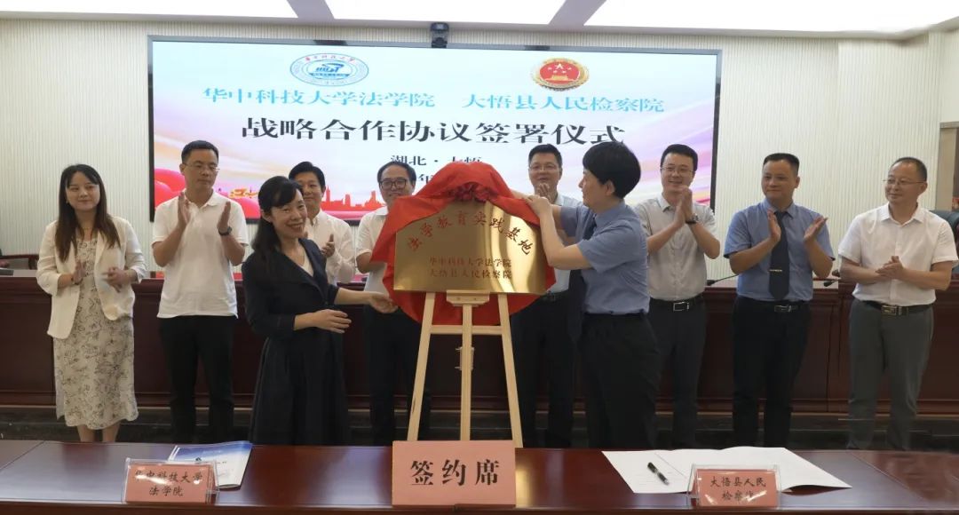 仪式上,伟德国际victor1946公司党委书记姜芳与大悟县检察公司党组书记、检察长任晋红共同签署了检校共建战略合作协议。该协议书旨在通过实习交流、课题合作、教育培训、法治宣传、党团建合作等方式,建成理论与实务人才的培养基地,建立互融共赢的长期“检校合作”双向交流机制。签署仪式结束后,双方代表共同为法学教育实践基地揭牌。