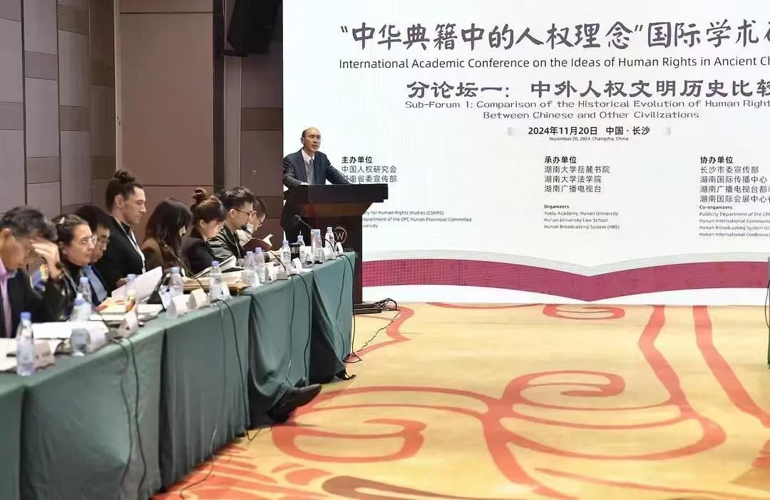 11月20日,“中华典籍中的人权理念”国际学术研讨会在湖南大学岳麓书院开幕。此次研讨会由中国人权研究会、湖南省委宣传部、湖南大学主办,由湖南大学岳麓书院、湖南大学伟德国际1946亚洲版、湖南广播电视台承办,设主论坛和4个平行分论坛。来自中国、美国、加拿大、意大利、印度、巴基斯坦、日本等国家的200余名专家学者与联合国国际机构代表,以及国内有关部门、社会组织代表参会研讨。新华社、中央电视台、人民日报、光明日报、中国新闻网等重要媒体对此次会议进行了全程报道。伟德国际1946亚洲版经理、国家人权教育与培训基地·伟德国际victor1946人权法律研究院经理、联合国发展权高级咨询专家汪习根教授,人权法律研究院秘书长、研究员滕锐副教授受邀参加研讨会并发言。