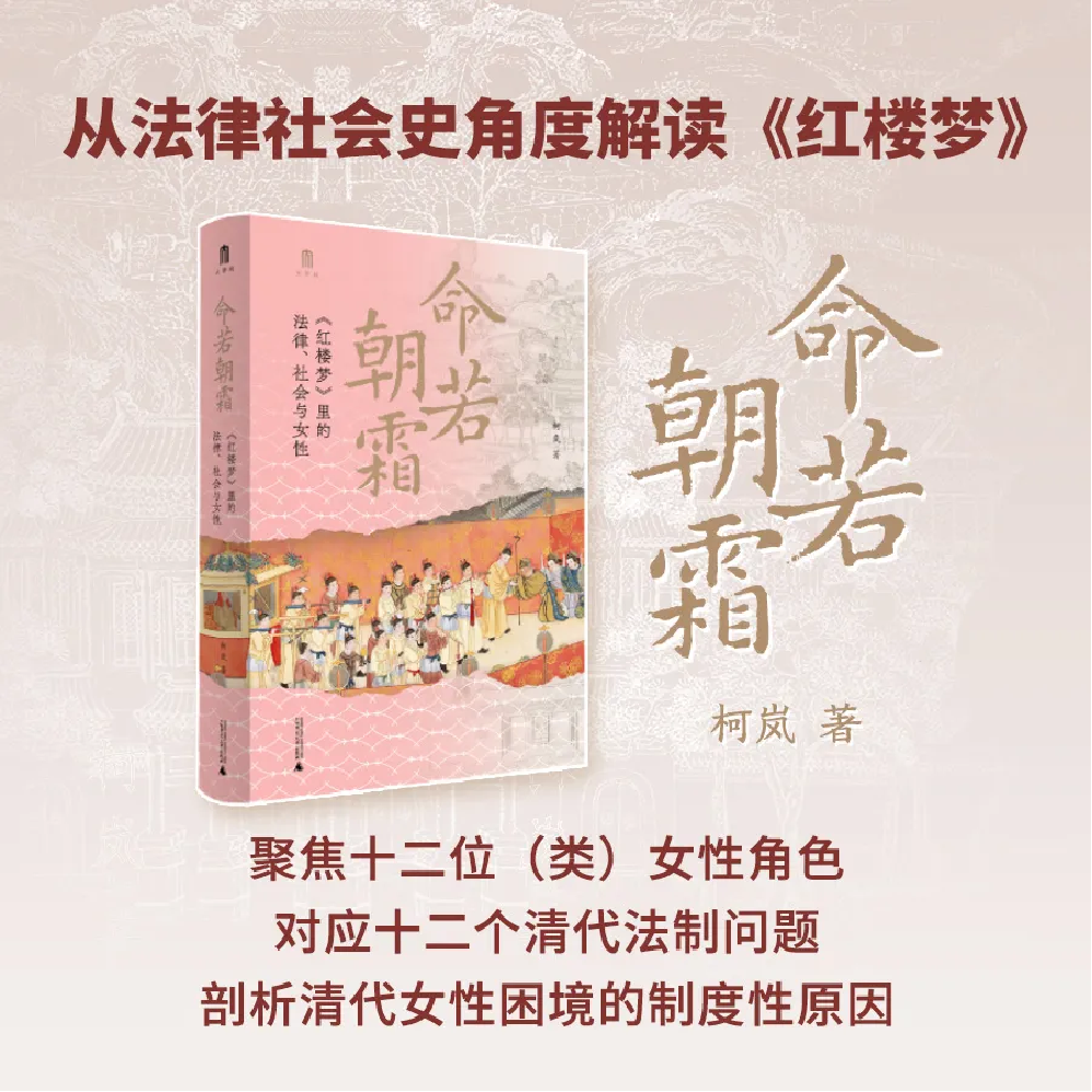 《命若朝霜:<红楼梦>里的法律、社会与女性》从法律社会史角度解读《红楼梦》,聚焦十二位(类)女性角色,对应十二个清代法制问题,还原清代女性的法律困境,考察清代性别、家庭、法律、政治间的互动与演变。作者综合多重视角,立足“法学与文学”研究路径,聚焦人口拐卖、生育、财产分配、官员考核等社会议题,分析了《红楼梦》作者及书内女性角色如何受到当时礼教与法律的限制、如何做出反抗与批判,展示了清代法律与社会的风貌。该书呈现诸多亮点:一是本书共十二章,每章聚焦一个《红楼梦》里女性命运的典型,如秦可卿、林黛玉、尤家姐妹等,分析她们如何因连坐、拐卖、生育、家庭财产分配等事件而陷入法律困境,进而被推上绝路。严酷的“亲属相奸罪”,使得秦可卿遭受尊长侵犯时选择了自尽;法律对女性继承权的苛刻限制,开启了林黛玉与尤家二姐妹的悲剧命运……二是书籍依据真实司法案例,剖析清代女性困境的制度性原因。清代法律如何制度性地决定了女性地位的低下?这些深层的制度性缺陷又如何成为曹雪芹绝望的根源?本书通过整理与《红楼梦》中事件类似的清代司法案例,揭露当时法制现实之下的深层结构,如封建等级制度、妇女结构性失权等,这些社会问题不仅是小说悲剧的根源,也是当时大多数人困境的根源。三是从“法学与文学”研究途径,为红学研究提供新意。作为长年钻研清代法律与社会的法律学者,柯岚教授透过分析《红楼梦》作者及书内角色如何受到当时法律的限制、如何作出反抗与批判,来还原已消亡的法律对彼时社会生活和艺术创作的影响,让我们对《红楼梦》有了更为丰富而真切的理解。四是多角度剖析清代法律与社会问题,窥见清代社会生活。本书解读《红楼梦》中角色的法律困境,既列举法律条款和案例,也联系《红楼梦》成书问题、作者身份问题,还综合清代制度史、经济史、人口学、民俗学等领域的研究成果,展现了一个立体、动态的清代社会。五是史料翔实,举证严谨。本书不仅使用大量来自《大清律例》《清会典》《刑案汇览》的材料,还从清代的奏折、起居录、笔记、地方志等文献之中整理出相关的案件记录和议论,并综合汉、晋、唐、宋等朝代的法律和案例展开分析。