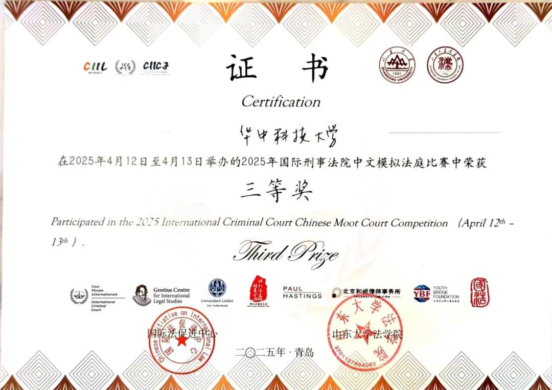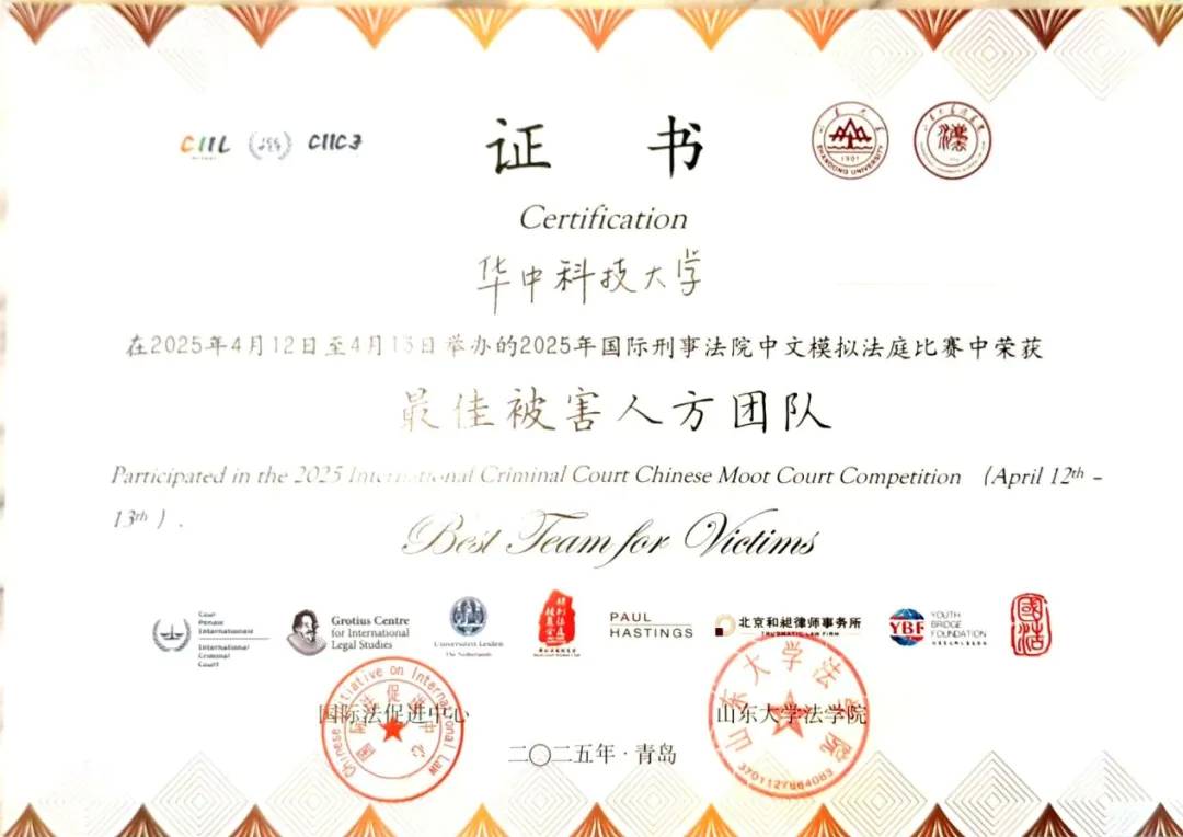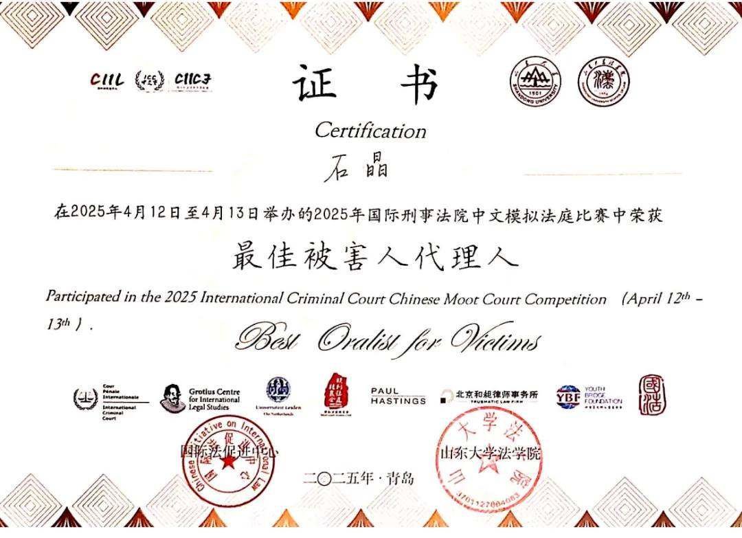 近日,2025年国际刑事法院中文模拟法庭竞赛正赛在山东大学(青岛校区)落下帷幕。经过激烈角逐,本次共收获三个奖项:公司代表队斩获全国三等奖、最佳被害人代理人团队奖,本科生石晶获评“最佳被害人代理人”。