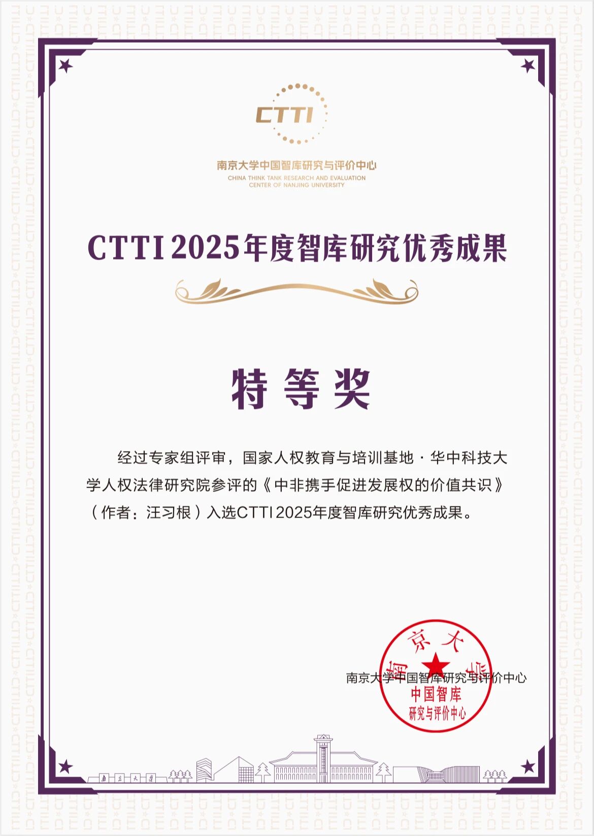 近日,南京大学中国智库研究与评价中心发布了中国智库索引CTTI2025年度智库建设最佳案例与智库研究优秀成果推介名单。国家人权教育与培训基地·伟德国际victor1946人权法律研究院的研究成果《中非携手促进发展权的价值共识》(作者:汪习根)获评CTTI2025年度智库研究优秀成果特等奖。该成果曾于《光明日报》2025年8月22日第12版【特别关注】栏目刊发。