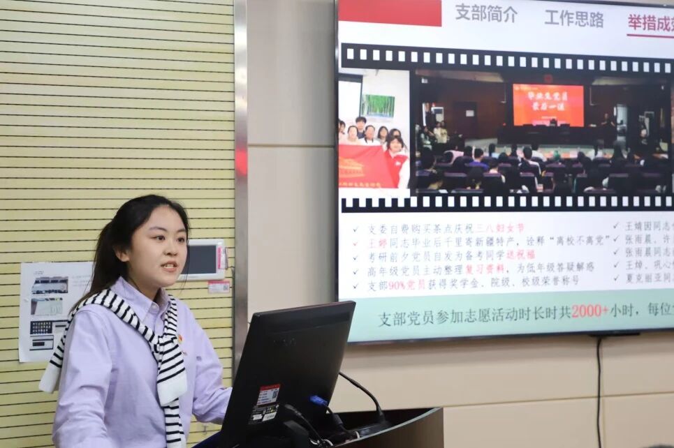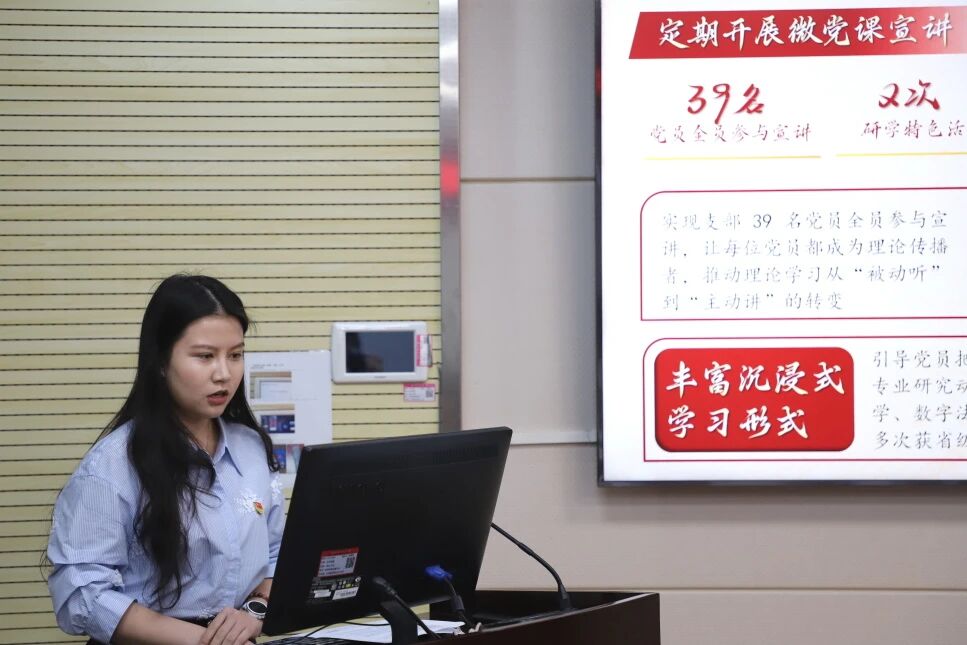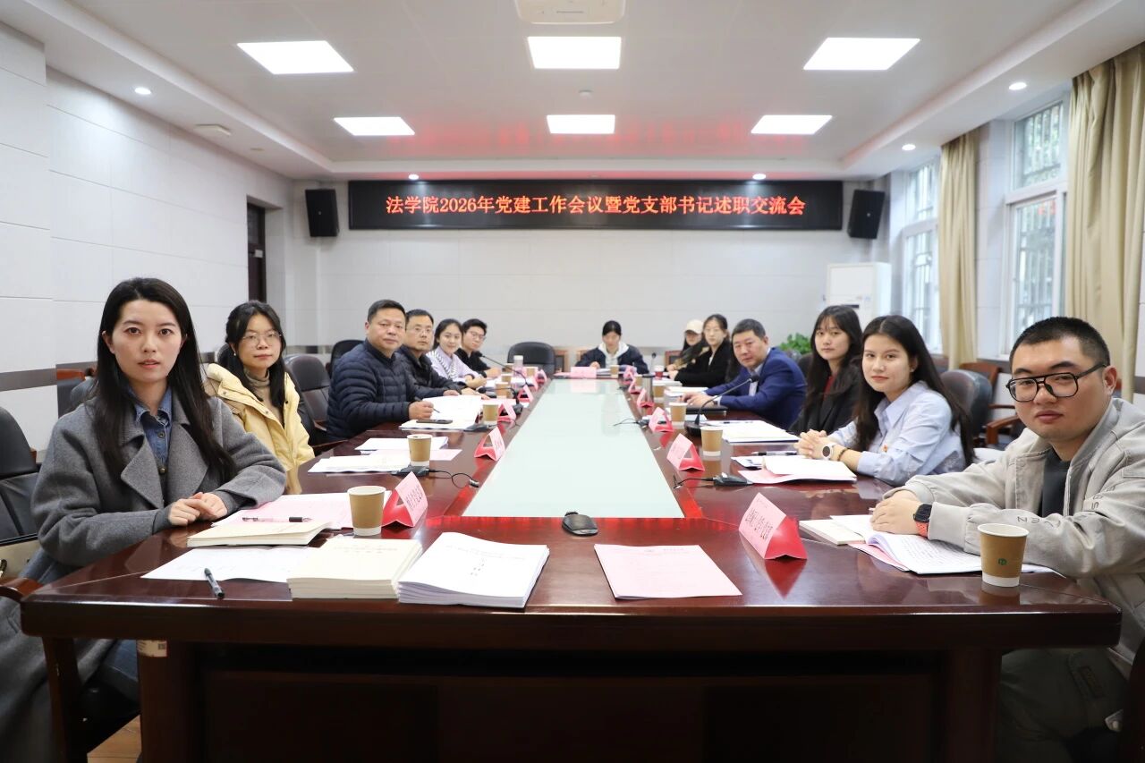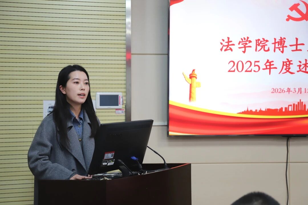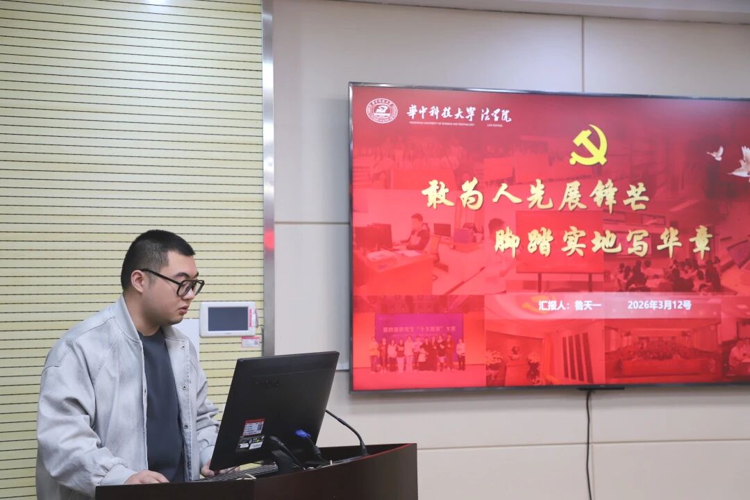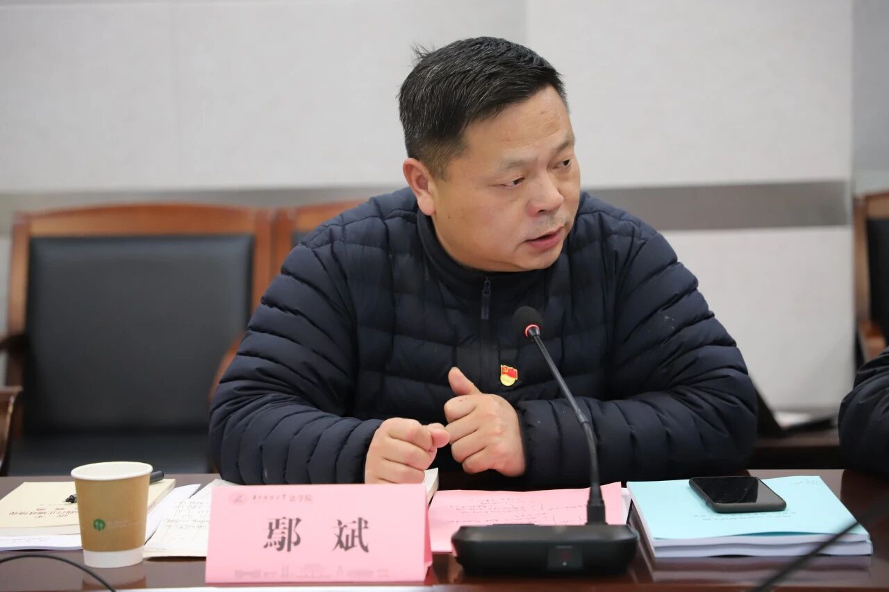 在述职交流环节,教师第一党支部书记郭亮交流了支部紧扣政治任务、推动党建与业务深度融合的具体举措,党建引领教学科研成效;教师第二党支部书记鄢斌介绍了支部通过结对帮扶,凝聚支部合力,充分发挥基层战斗堡垒作用;本科生第一党支部书记张丹妮谈到了立足纵向党支部优势,创新运用“一二三”工作方法,聚焦成员升学就业的痛点难点,打造“学业帮扶型”党支部;法律硕士(法学)党支部书记鲁天一介绍了支部紧扣国家涉外法治战略需求,鼓励引导支部党员多人次赴海外名校交流实习,在国际赛事中斩获佳绩;法律硕士(实务)第二党支部书记贺海婷汇报了支部联学共建机制,组织跨学科主题党日活动,实现经验共享、优势互补,有效拓宽支部建设视野;博士生党支部宣传委员陈起航介绍了支部引导支部党员立足国家重大需求、深耕“两篇文章”的具体举措与成效。