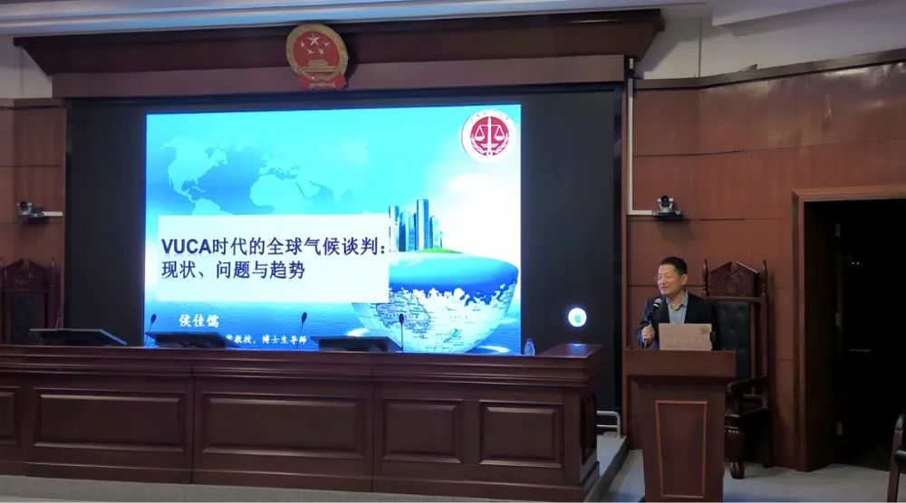 侯教授用问题导入方式引出商业社会常用的四个词:Volatile(不稳定性)、Uncertain(不确定性)、Complex(复杂性)、Ambiguous(模糊性),简称为VUCA,这四个词代表着当前的社会属性。从这四个方面来说,气候变化是一个科学性问题。接着侯教授从气候议题复杂性、气候科学的不确定性、全球气候谈判机制先天不足、全球减排制度设计缺陷四个方面详细阐述当前环境法所面临的挑战。