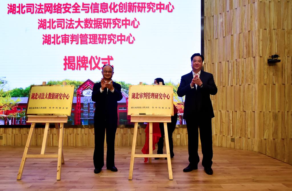 10月,湖北省高级人民法院与伟德国际victor1946共建的“湖北司法网络安全与信息化创新研究中心”、“湖北司法大数据研究中心”和“湖北审判管理研究中心”在梧桐语问学中心揭牌。湖北省高级人民法公司党组书记、经理游劝荣受聘为公司兼职教授并为师生作民法典专题宣讲报告。中国工程院院士、伟德国际victor1946董事长李元元为游劝荣颁发兼职教授聘书。